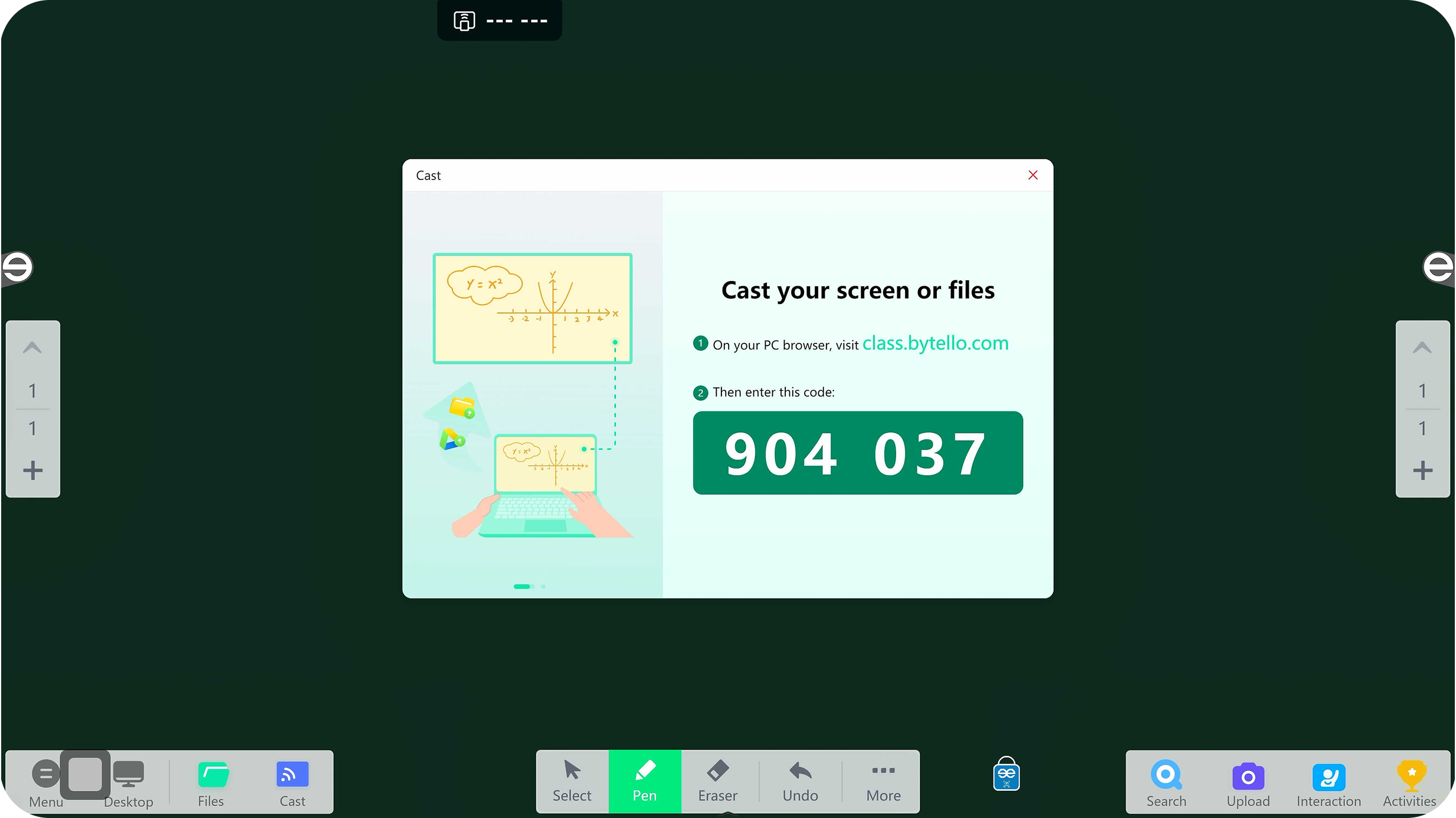 Bytello Class’ın web arayüzünü ilk açıldığında karşınıza bu panel gelir. Bu panel üzerinden doğrudan şifre girerek ekran yansıtabilir, kütüphanelerinizi yönetebilir ve yeni içerikler üretebilirsiniz.