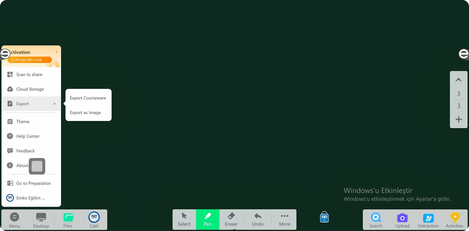Sol altta bulunan Menu’den Export butonuna tıklarsanız dilediğiniz formatta çalışma ekranlarınızı dışarı çıkarabilirsiniz.