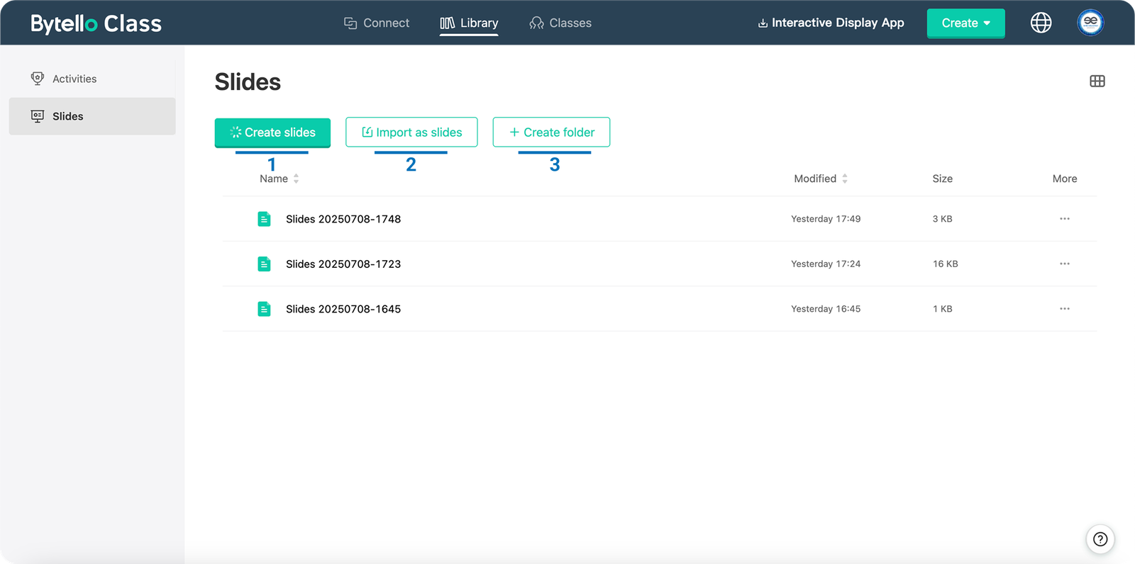 1- Create Slides: Class panelinde, gelişmiş slaytlar oluşturabileceğiniz paneli açar.