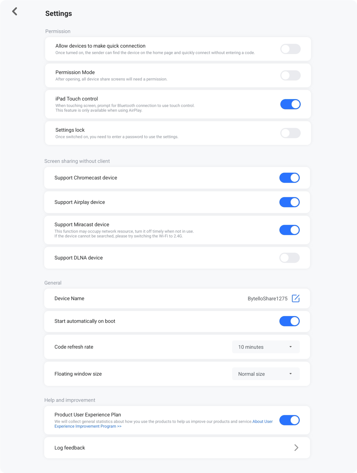 Otomatik başlatma: Panel açıldığında Bytello Share otomatik başlar.