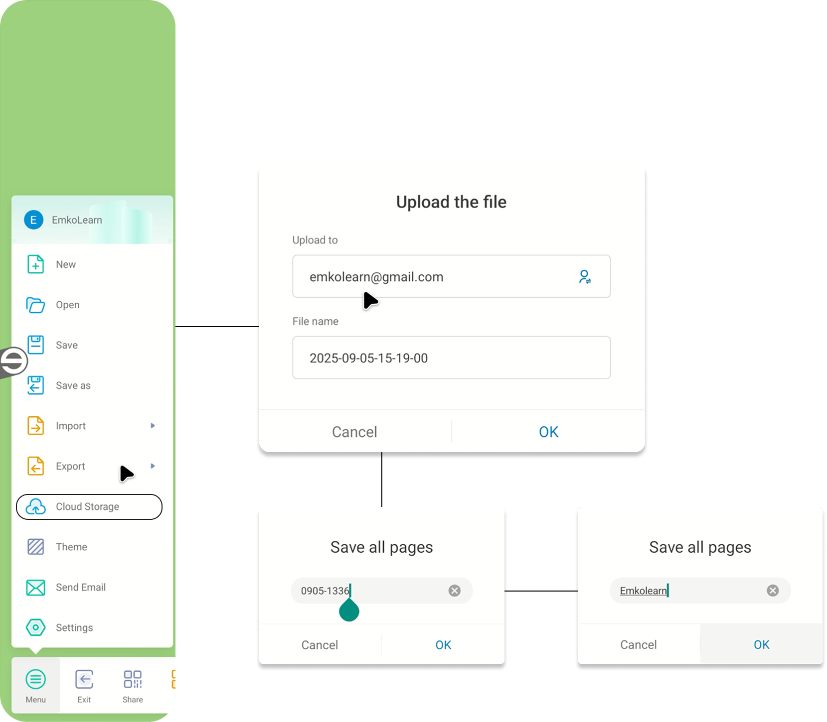 EmkoDraw, çalışmalarınızı yalnızca cihazınıza kaydetmekle sınırlı değildir. Dilerseniz tuvalleri doğrudan Google Drive, OneDrive gibi bulut hesaplarınıza aktarabilirsiniz. Böylece dosyalarınıza farklı cihazlardan da kolayca erişebilir, çalışmalarınızı güvenle saklayabilirsiniz.