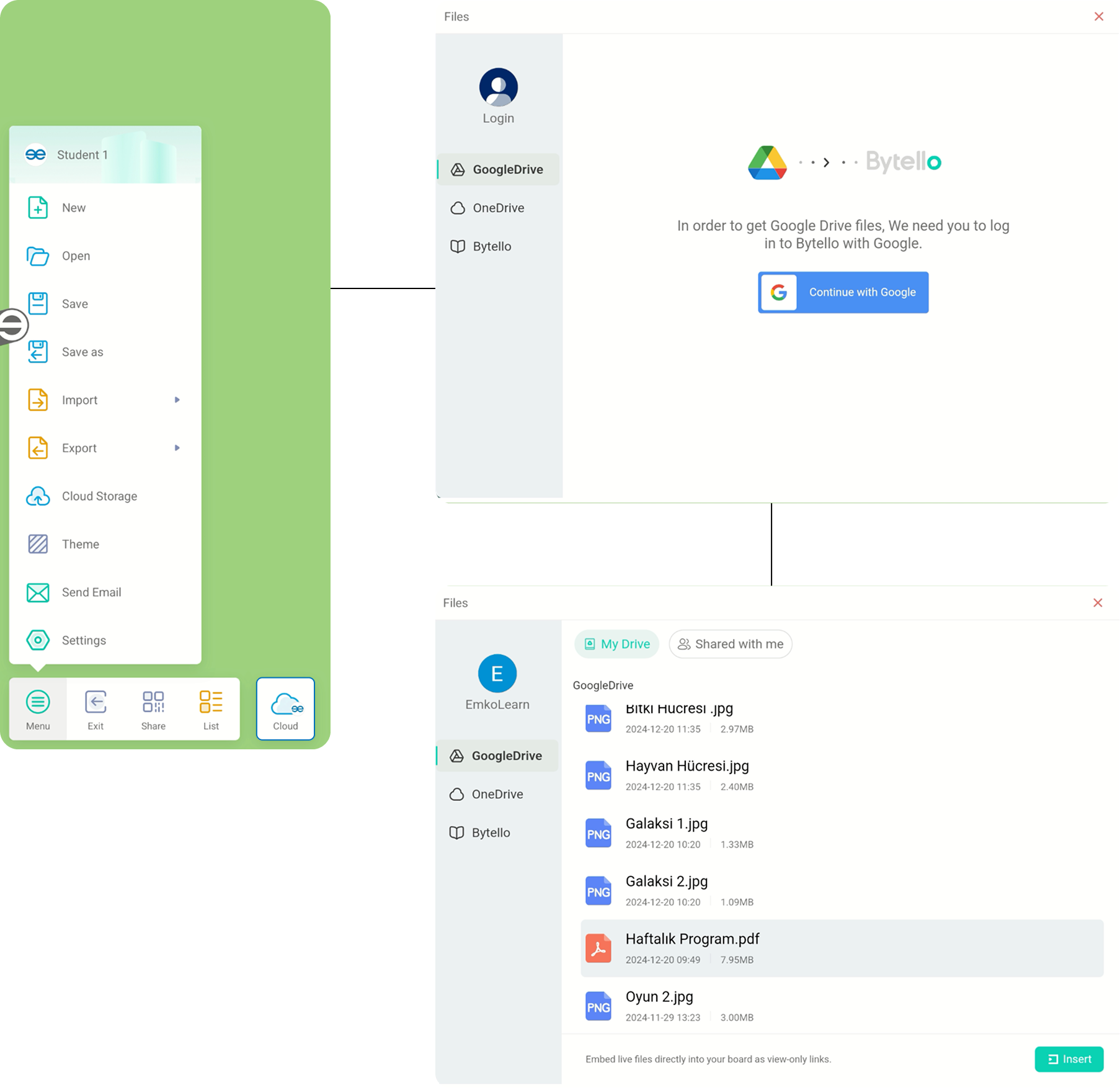 Ekranın sağ alt kısmında bulunan Cloud butonuna tıklayın ve kullanmak istediğiniz bulut hesabını açın. Google Drive, OneDrive veya kendi Bytello hesabınızı seçebilirsiniz. Ardından istediğiniz dosyayı belirleyip çalışma alanına ekleyin. Dosya, anında tuval üzerine yansıyacak ve düzenlemeye hazır hâle gelecektir.