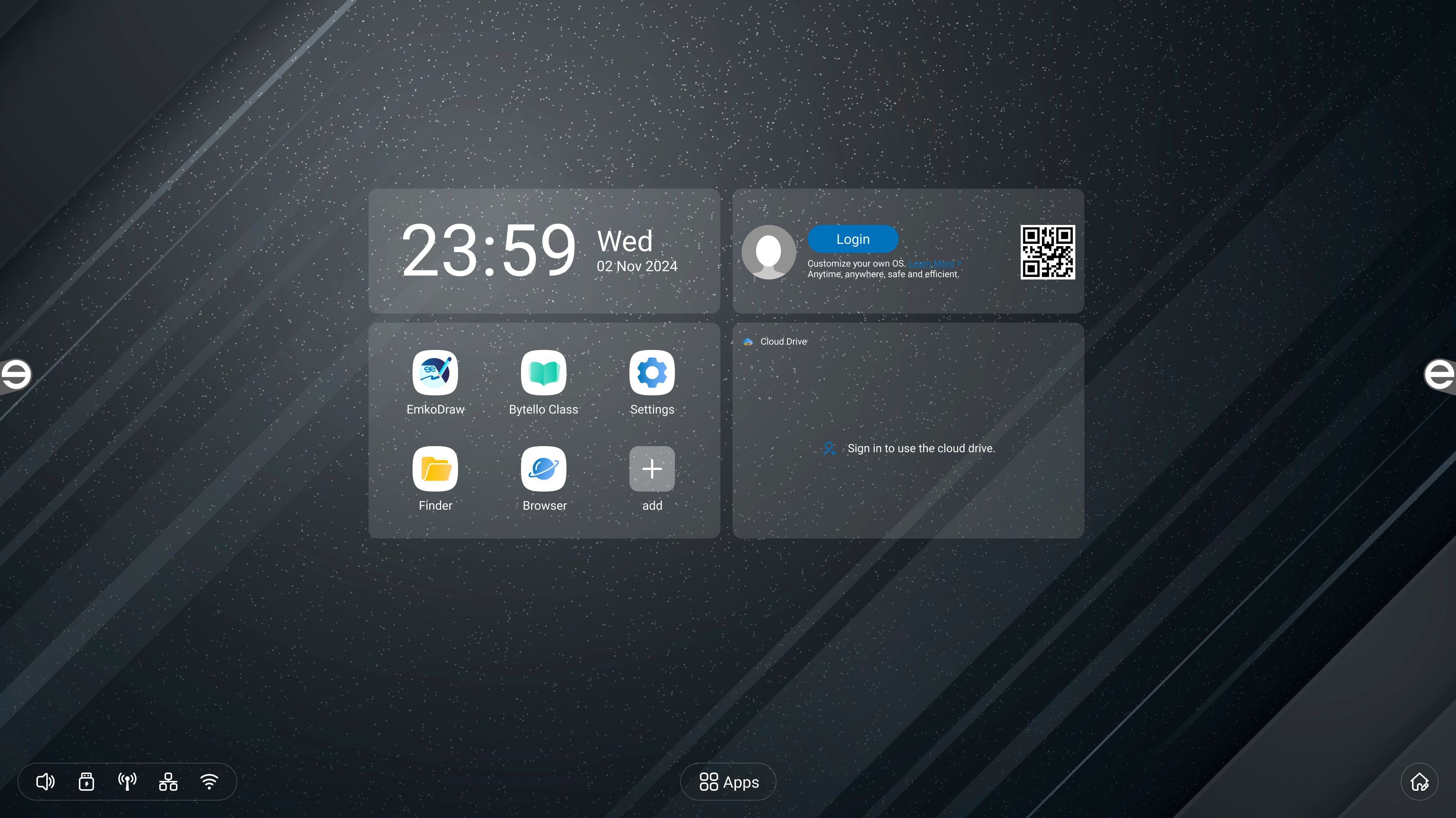 Emko’nun kurumsal arayüzü, toplantı odaları ve profesyonel kullanım senaryoları için özel olarak optimize edilmiştir. Ana ekranda varsayılan olarak EmkoDraw, Tarayıcı, Ayarlar, Bytello Class ve Dosyalar ikonları yer alır. Kullanıcılar ayrıca ihtiyaçlarına uygun bir ekstra uygulama ikonunu da seçerek arayüzü özelleştirebilirler. Minimal ve şık tasarımı sayesinde arayüz, hızlı ve pratik bir başlangıç sunar. Böylece kurum içi toplantılardan profesyonel sunumlara kadar her süreç daha verimli, düzenli ve kullanıcı dostu bir şekilde yönetilebilir.