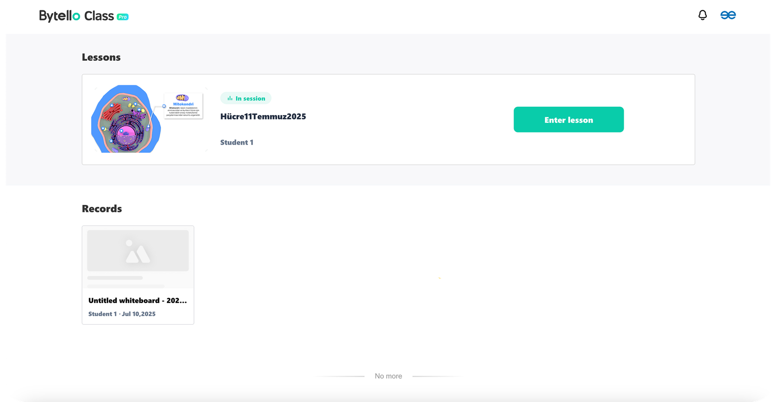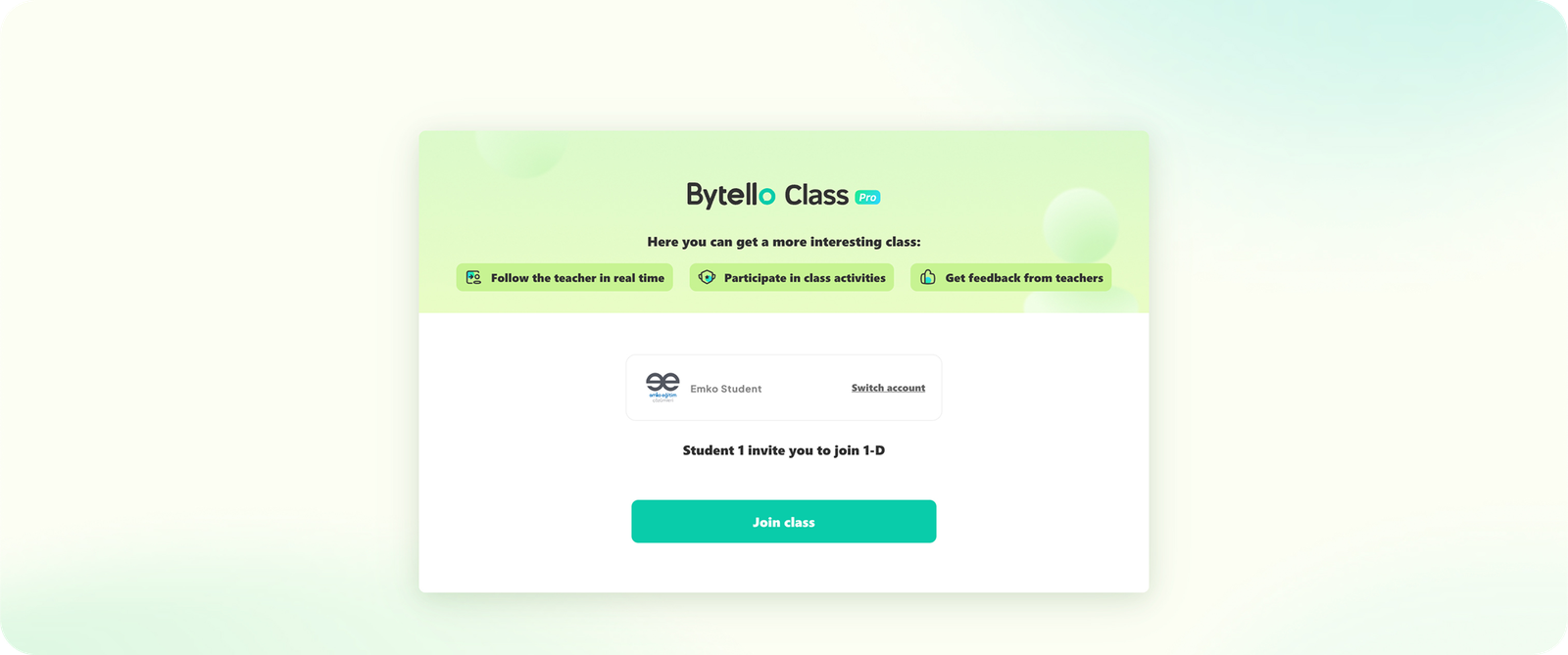 Öğrenciler, https://student.bytello.com adresinden Bytello Class'a giriş yapabilir. Her öğrenci, sisteme bağlandıktan sonra kendi ekranından derse katılım sağlayabilir, ders materyallerini görüntüleyebilir ve kendi notlarını oluşturabilir.