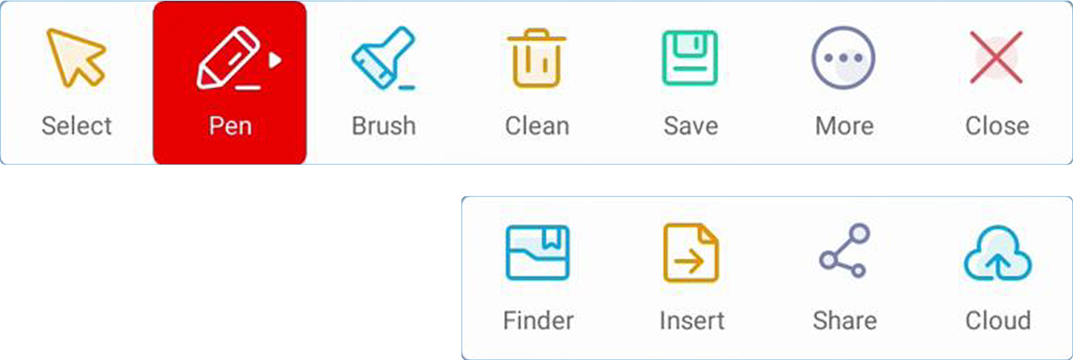 Ekranın yanlarına sabitlenmiş ikona dokunduğunuzda menü açılır. tüm sistem işlevlerine ve araçlara erişmenizi sağlar. Geri ve Backstage butonları, yan barların üst kısmında her zaman sabittir.
